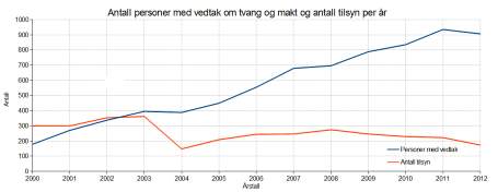 Figur 1: Antall personer med vedtak om bruk av tvang og makt samt antallet tilsyn med bruken av tvang og makt.