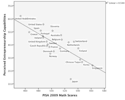 Figur 2: Sammenhengen mellom landenes PISA-skåre i matematikk og landenes skåre i entreprenørskap (fra Young Zhaos nettside).