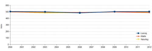 Figur 1: Norske elevers skåre på de fem publiserte PISA-undersøkelsene i fagene lesing, matematikk og naturfag.